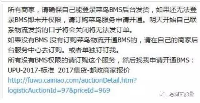一批天貓國際商家在商家群里收到菜鳥小二的通知:所有商家,請確保自己能登錄菜鳥BMS后臺發貨,還未訂購菜鳥服務開通BMS的,需及時訂購,否則從明天開始,自己聯系物流發貨的后臺接口將被關閉,無法再發訂單。